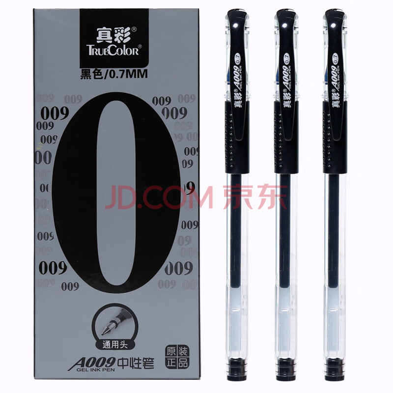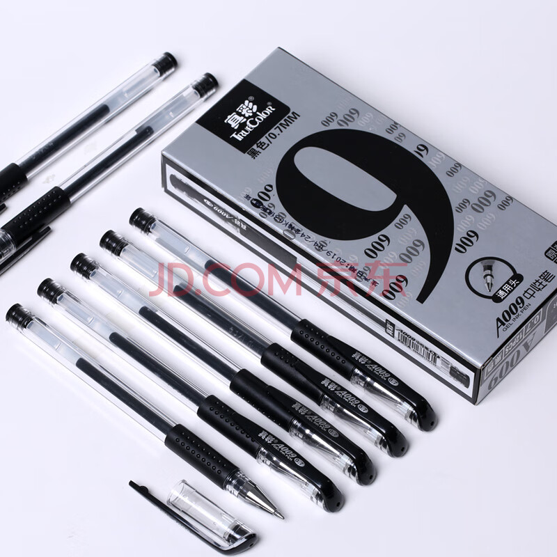 商品相册:真彩(TRUECOLOR)0.7mm黑色中性笔经典办公子弹头拔帽签字笔商务水笔学生考试文具用品刷题笔热门商品 12支/盒 A009第