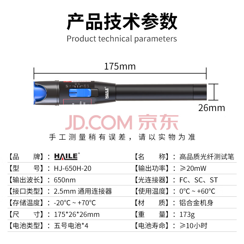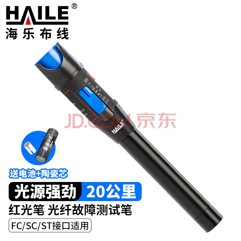 商品相册:HAILE海乐 红光笔20mw光纤测试笔 通光笔/打光笔20公里SC/FC/ST接头通用 1支 HJ-650H-20第