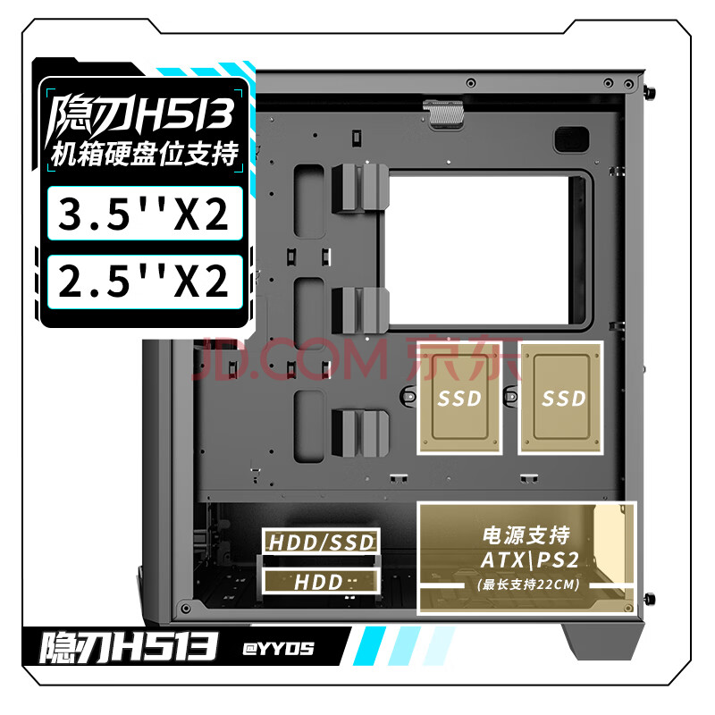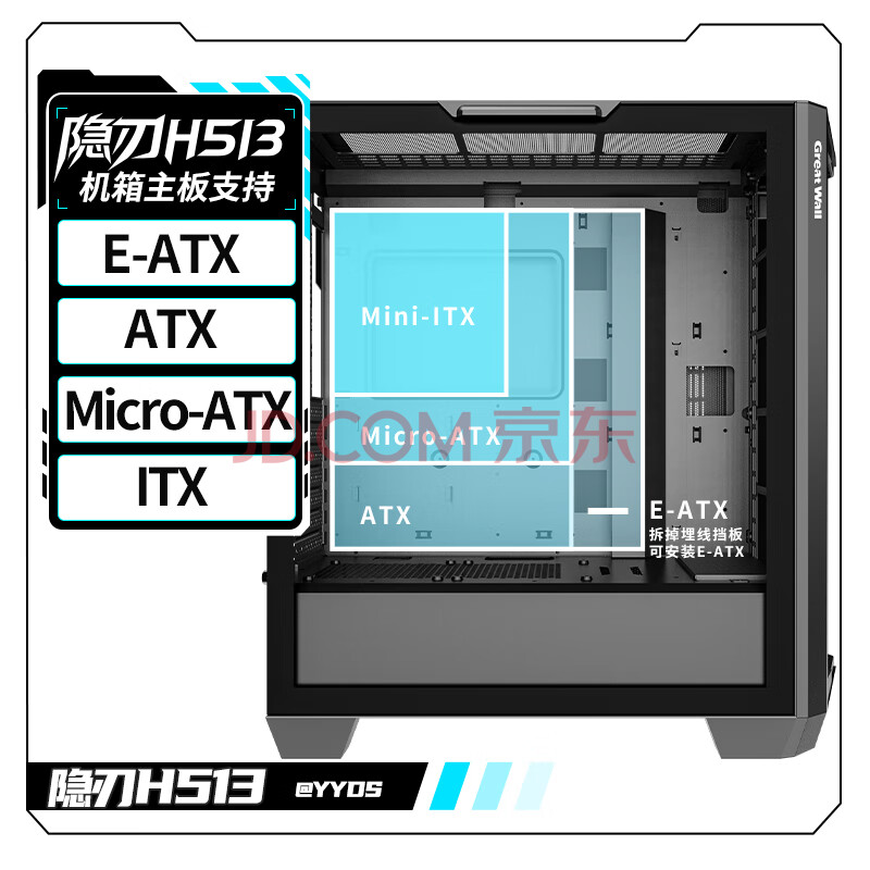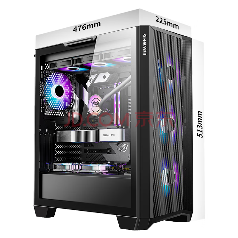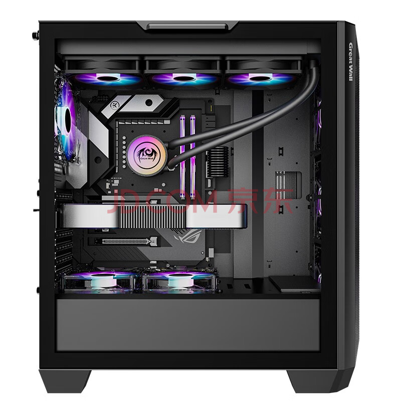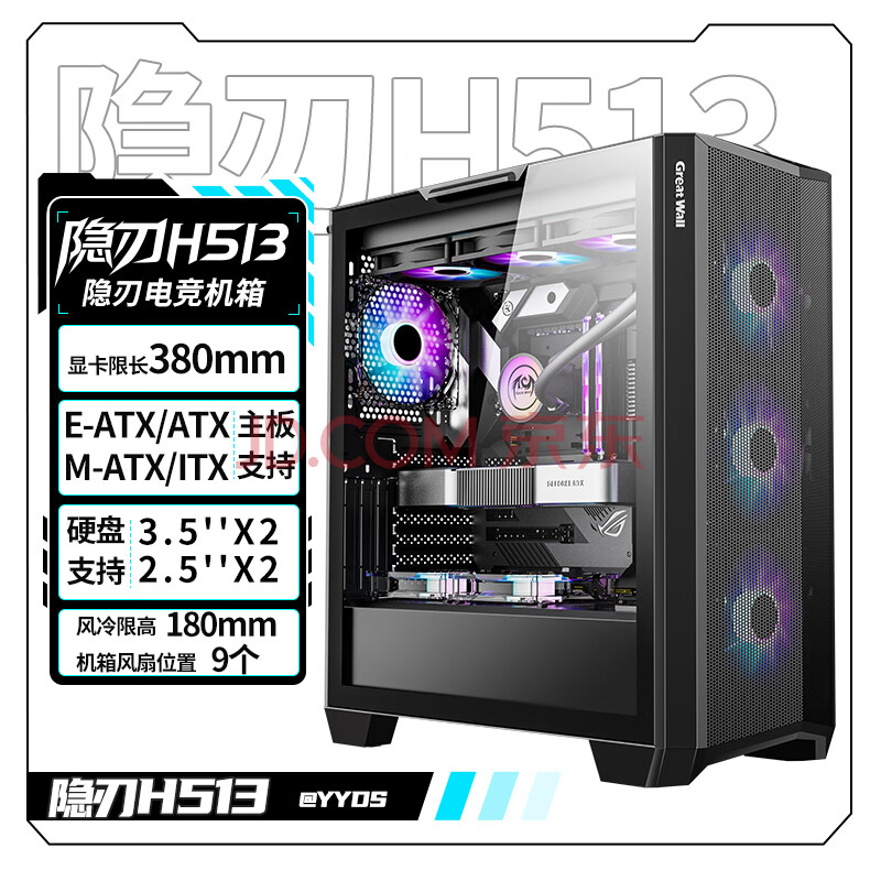 商品相册:长城(Great Wall)隐刃H513黑色电脑机箱(金属面板/E-ATX主板/360水冷位/0.8mm厚侧板/玻璃侧透/9风扇位/5090显卡)第