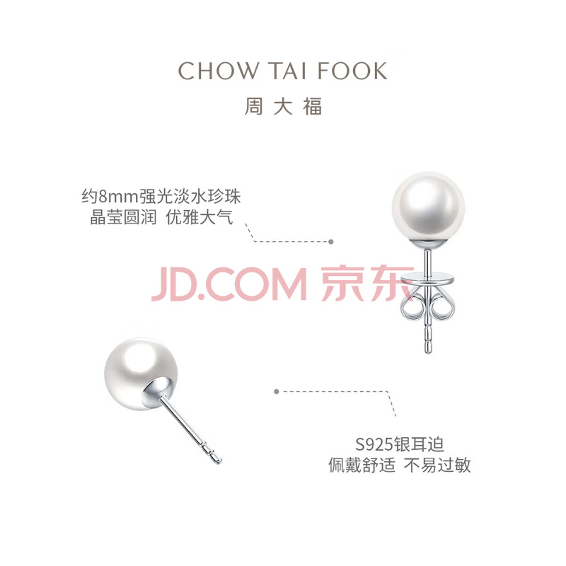 商品相册:周大福简约时尚 925银镶珍珠耳钉 AQ33137 直径约8-8.5mm礼物第