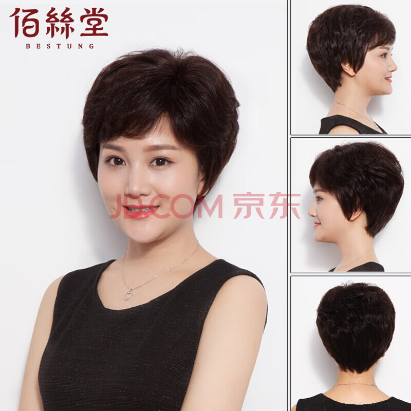 商品相册:佰丝堂假发女短发中老年妈妈自然全头套假发套100%全真人发丝短卷全真发第