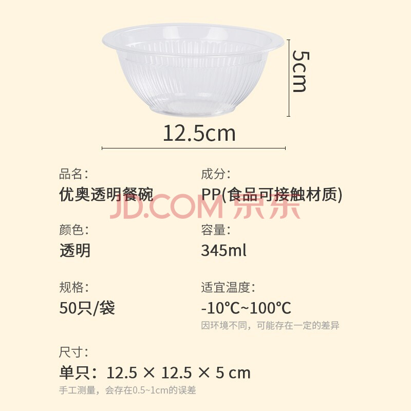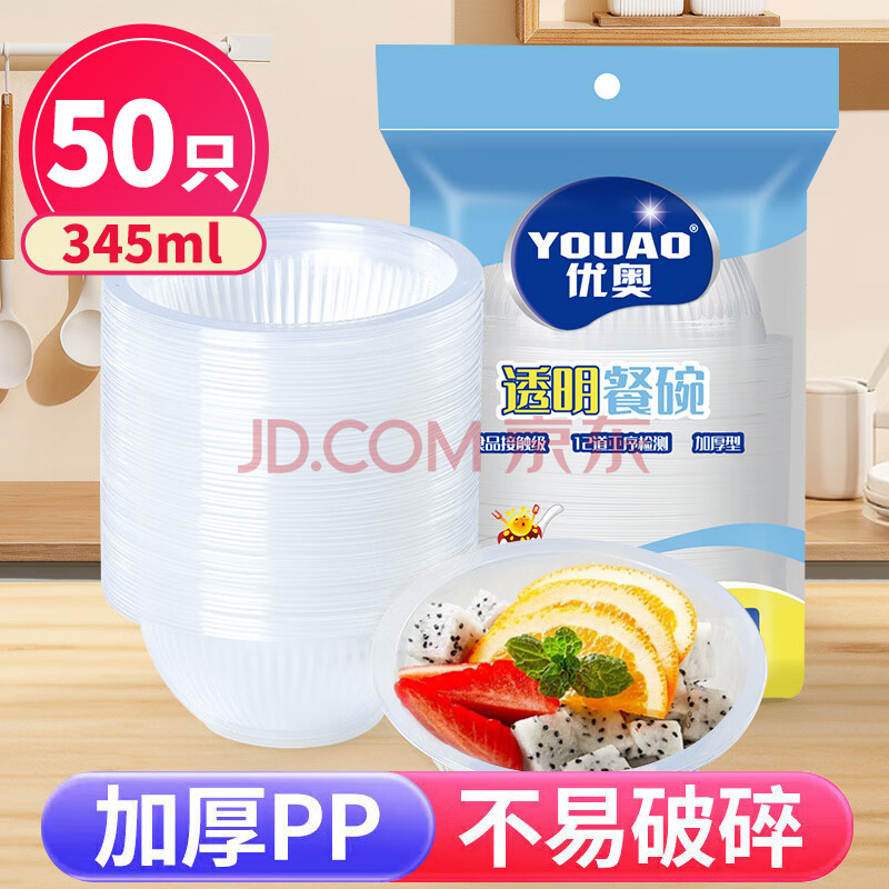 商品相册:优奥一次性碗345ml*50只加厚透明饺子汤圆汤碗户外野餐露营餐具免洗第1张/共7