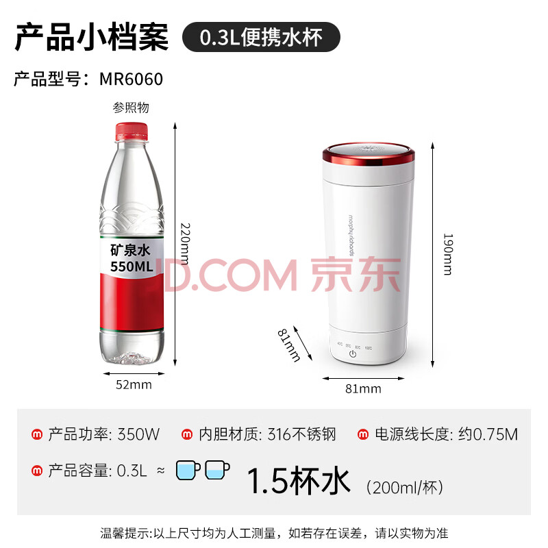 商品相册:摩飞电器(Morphyrichards)电热水杯电热水壶 家用旅行便携式烧水壶烧水杯 0.3L随行冲奶泡茶办公养生保温杯电热杯MR6060白第