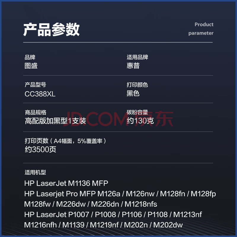 商品相册:图盛388a硒鼓碳粉墨粉适用惠普m1136 m126a m126nw hp1108 p1106 p1007 m128fn m1213nf cc388a打印机墨盒第1张/共6