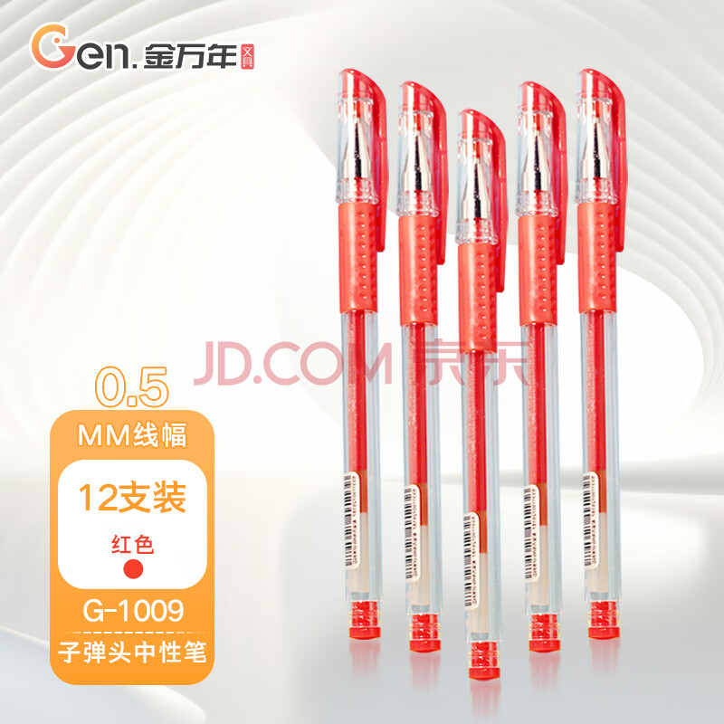 商品相册:金万年 0.5mm红色中性笔子弹头 会议签字笔 学生标记水性笔 学生考试专用笔 (12支装) G-1009-003第