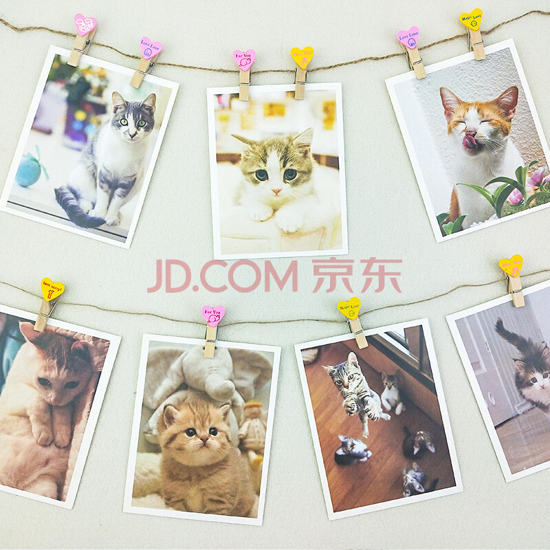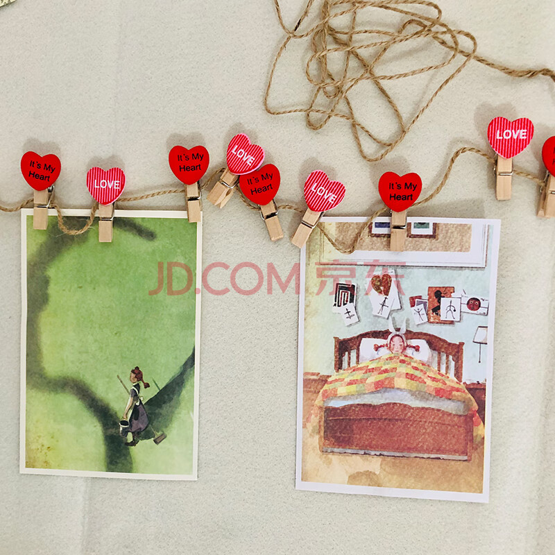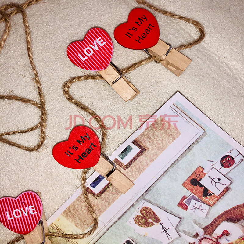 商品相册:芬尚 韩版心形卡通彩色木夹 幼儿园教室照片挂墙装饰夹套装 红色爱心小木夹10个装(含麻绳约2米)第