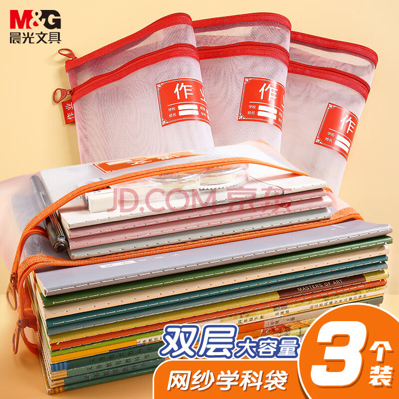 商品相册:晨光(M&G)文具 双层A4文件袋小学生 透明网格学科分类袋 试卷科目分类拉链袋书本作业袋 3个装ADM929WA第