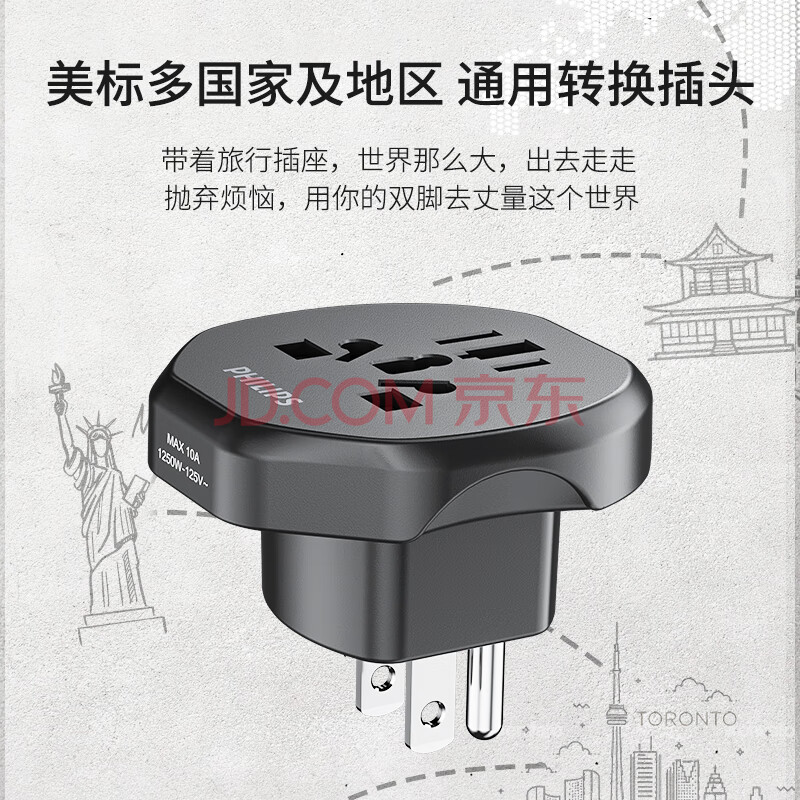 商品相册:飞利浦(PHILIPS)多国通用旅行插座/美标转换插头/插座转换器/适用于美国加拿大日本菲律宾泰国第