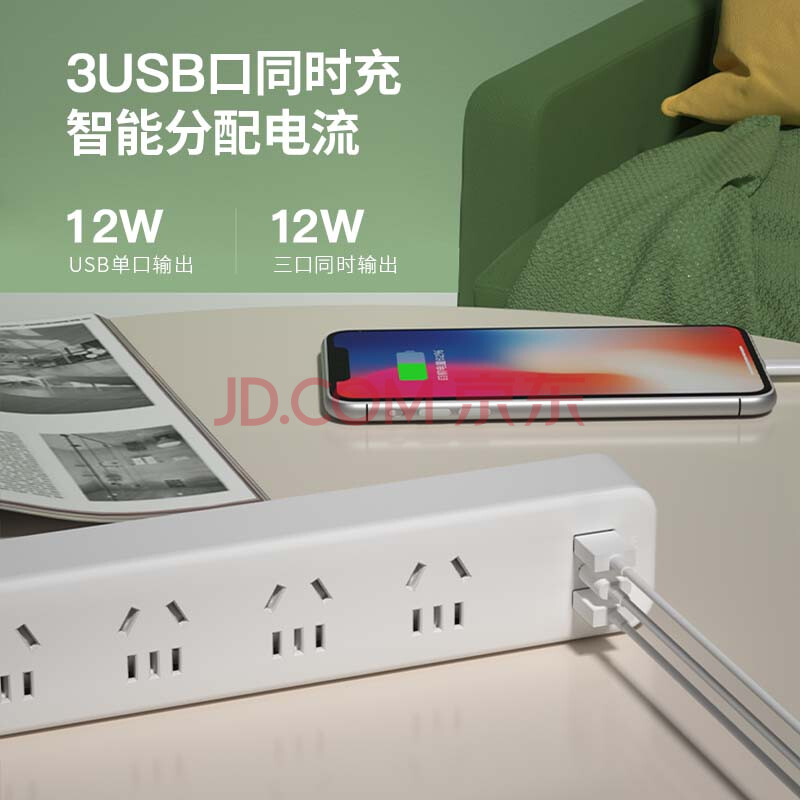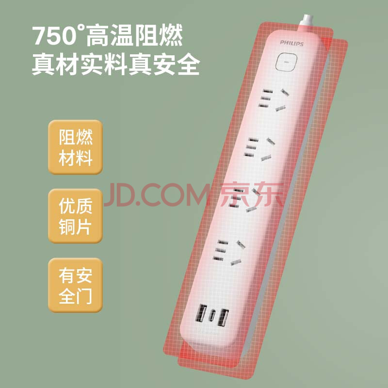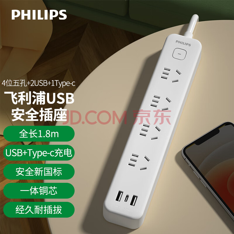 商品相册:飞利浦(PHILIPS)安全智能USB插座 4位总控1.8米 插排/插线板/排插/拖线板/3USB接口多功能插板第