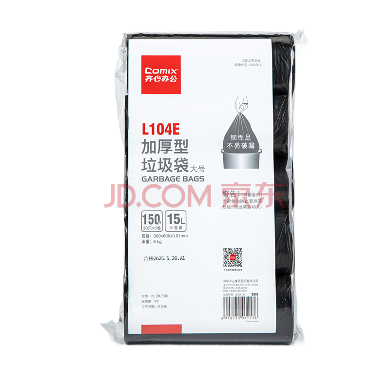 商品相册:齐心(COMIX)5卷150只加厚大号办公生活垃圾袋50*60cm 垃圾分类 办公用品 工具 黑色L104E第