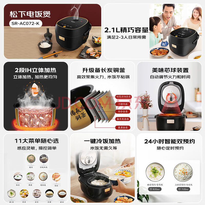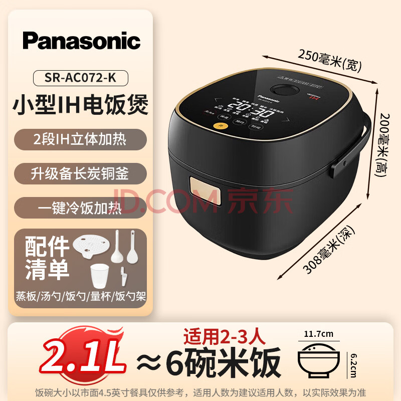 商品相册:松下(Panasonic)电饭煲2-3人IH加热迷你电饭锅家用小型多功能不粘锅智能预约2.1升SR-AC072-K第