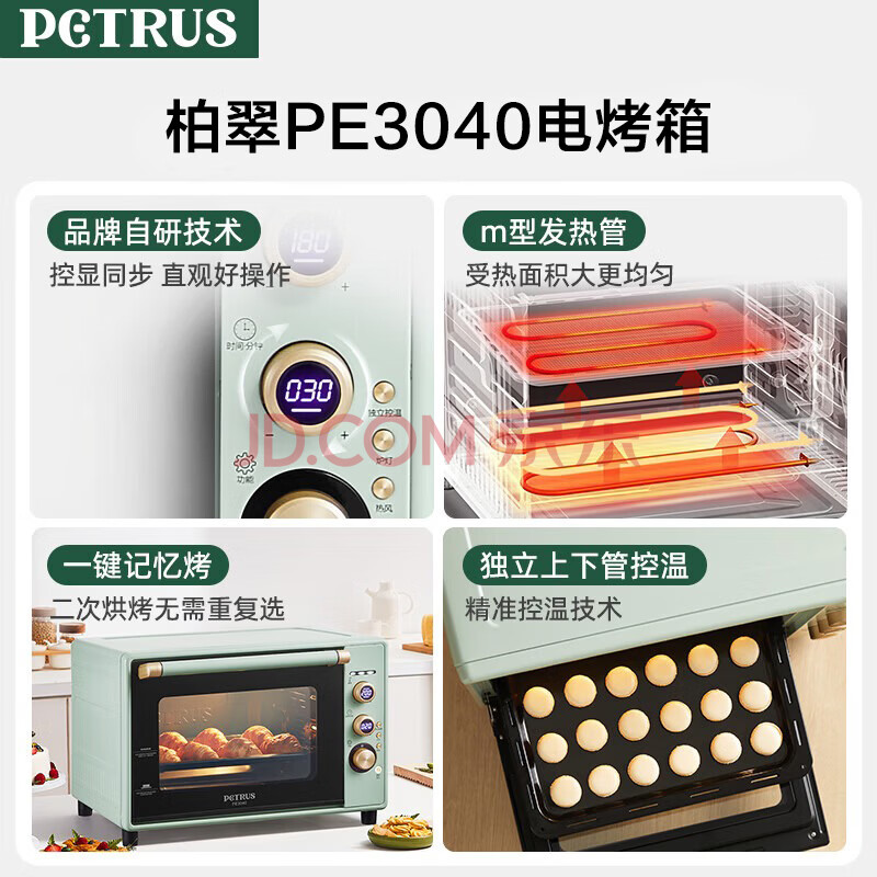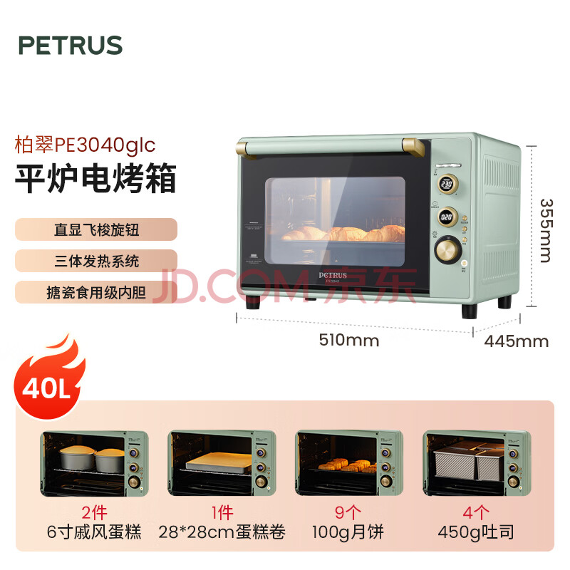 商品相册:柏翠(petrus)电烤箱家用40L容量搪瓷内胆独立控温热风循环PE3040GLC 第