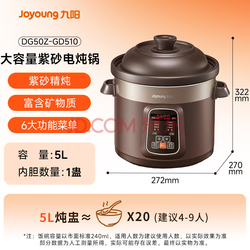 商品相册:九阳(Joyoung)电炖锅电炖盅5L大容量紫砂预约电砂锅 多功能锅 智能定时精炖煮粥煲汤锅DG50Z-GD510第