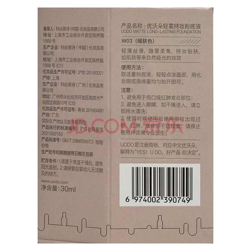 商品相册:优沃朵(UODO)羽纱柔雾粉底液30ml遮瑕持妆雾面混油皮W03暖肤色女友礼物第