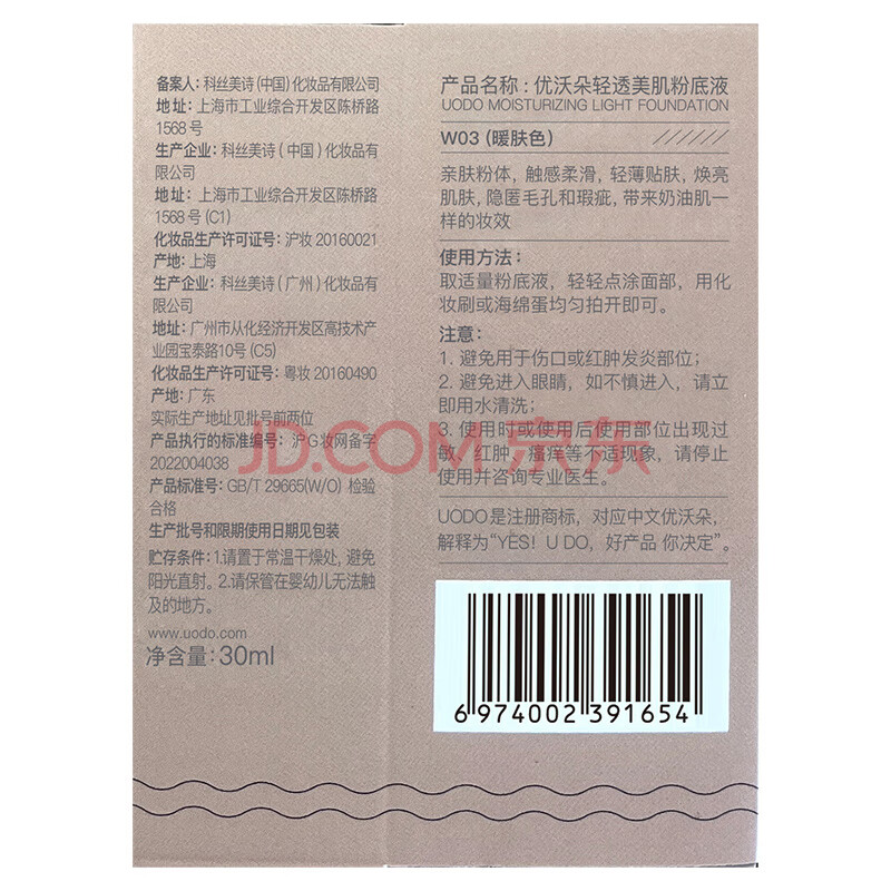 商品相册:优沃朵(UODO)轻透美肌粉底液30ml奶油肌不卡粉遮瑕水润W03暖肤色女友礼物第