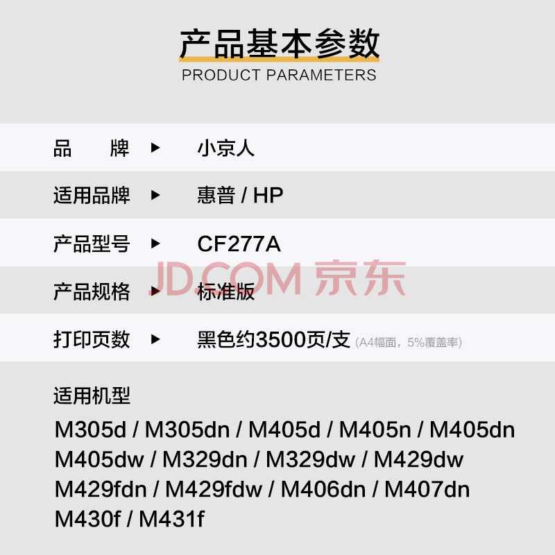 商品相册:小京人M429fdw硒鼓适用惠普405d 405dn/M405dw/n墨盒 M305d/dn 329mw/dn 429dw 429dn 77A打印机硒鼓无芯片第