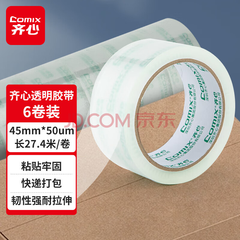 商品相册:齐心(COMIX)(Comix)透明胶带/宽胶带/封箱胶带加厚快递打包胶带透明6卷宽45mm*30y*50um长27.4米/卷JF4503-6第