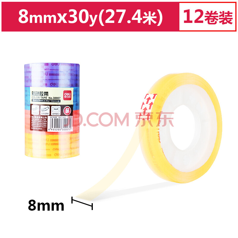 商品相册:得力(deli)易撕彩色透明胶带 8mm*30y高粘小胶带 开学必备学习用品 学生文具 12卷/筒 办公用品 30007第1张/共5