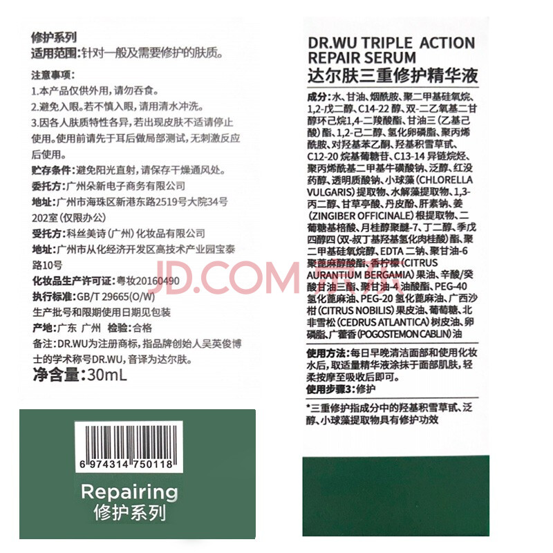 商品相册:达尔肤(DR.WU)三重修护精华液30ml痘印祛淡化红印舒缓维稳屏障敏女生礼物第