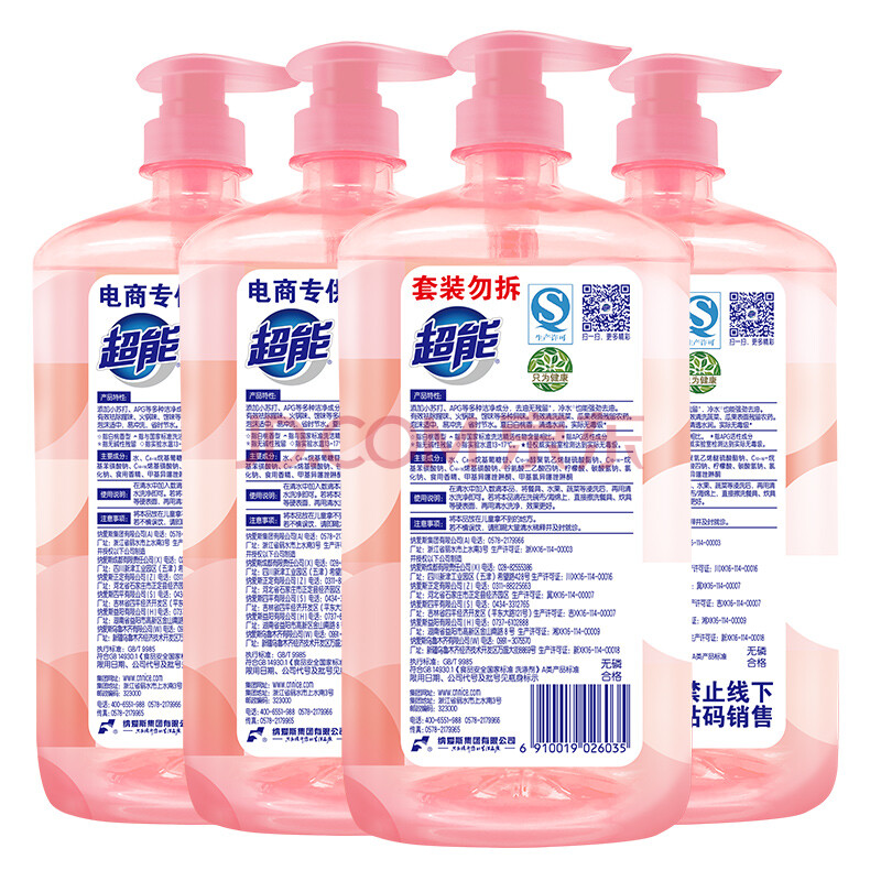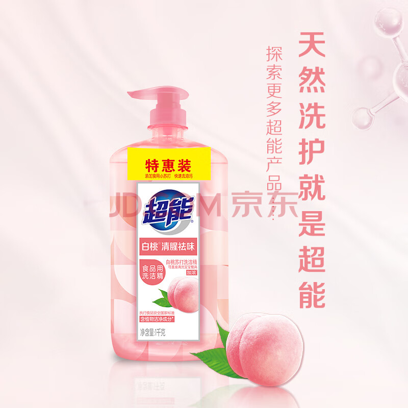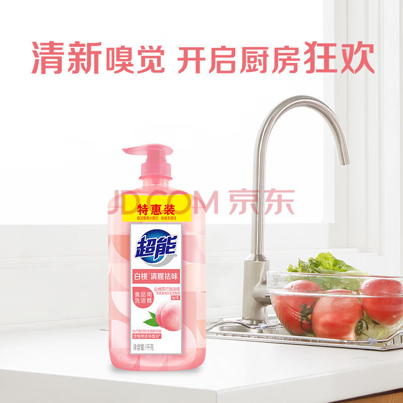 商品相册:超能白桃苏打洗洁精1kg*4瓶 清新祛味 加浓配方快速去油 APG植物洁净第