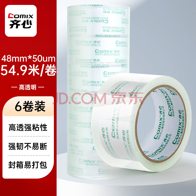 商品相册:齐心(COMIX)透明胶带/宽胶带/封箱胶带/防风胶带 高透明 打包胶带透明 6卷 宽48mm*60y*50um长54.9米/卷 EP027第