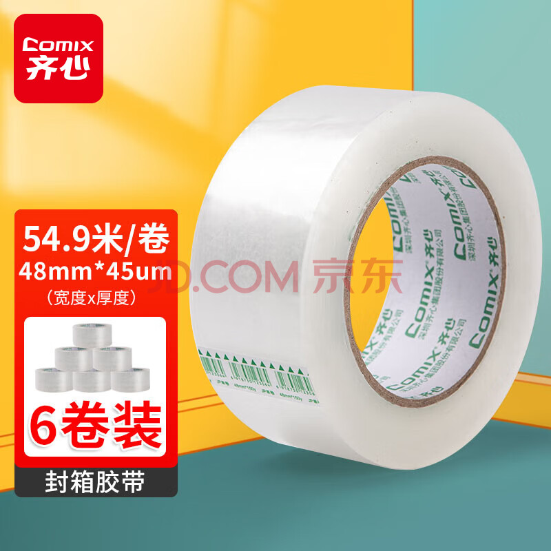 商品相册:齐心(COMIX)(Comix)透明胶带/宽胶带/封箱胶带快递打包胶带透明6卷宽48mm*60y*45um 长54.9米/卷 JP4806-6第