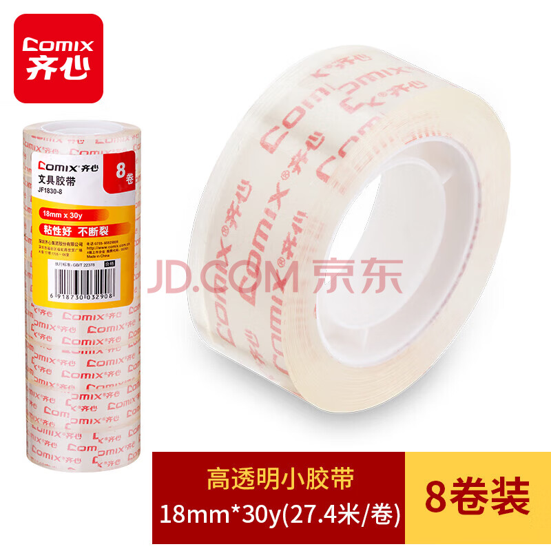 商品相册:齐心(COMIX)高透明小胶带8卷装 宽18mm*长27.4米/卷 易撕高粘性 办公学生文具用品 JF1830-8第1张/共5