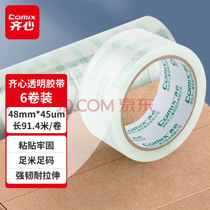 商品相册:齐心(COMIX)(Comix)透明胶带/宽胶带/封箱胶带快递打包胶带透明6卷宽48mm*100y*45um 长91.4米/卷 JP4810-6第