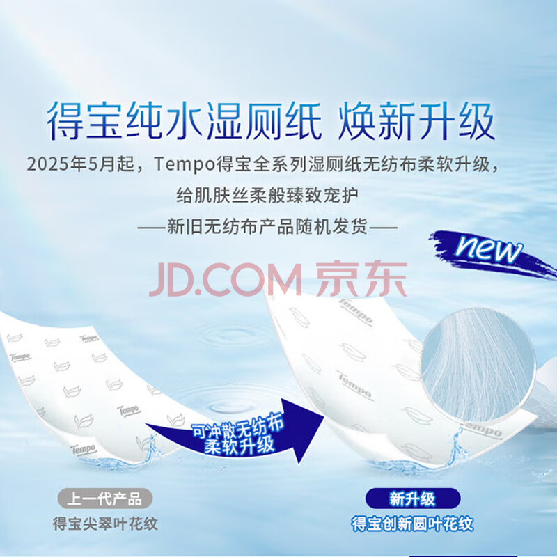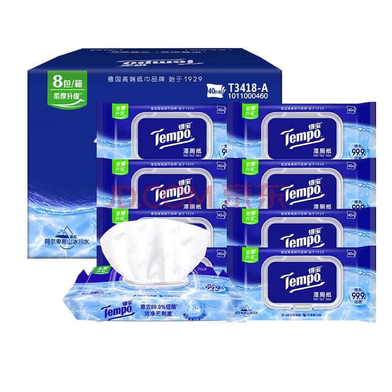 商品相册:得宝(TEMPO)一博同款 纯水湿厕纸 大尺寸40片*8包 深澈水感 可冲散 湿纸巾 第