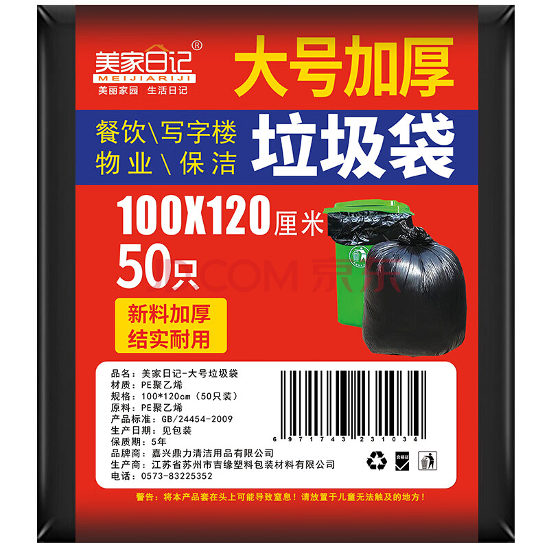 商品相册:美家日记平口垃圾袋 黑色100*120cm/50只单面2丝加厚抽取式商用平口收纳袋第