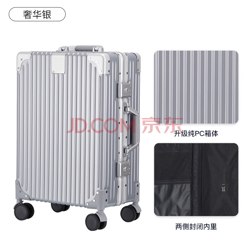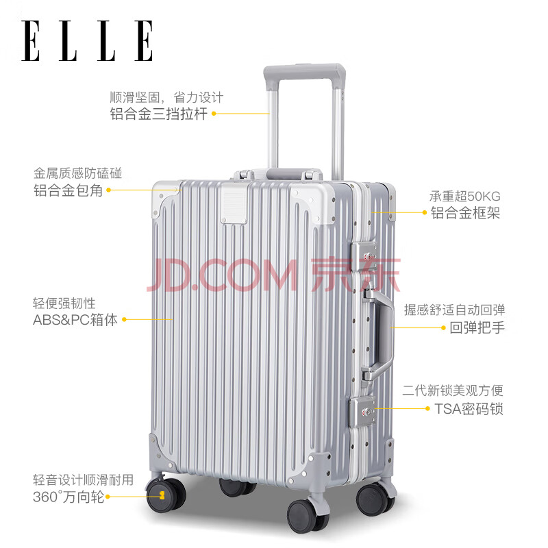 商品相册:ELLE法国20英寸银色行李箱时尚拉杆箱TSA密码锁万向轮可登机旅行箱第