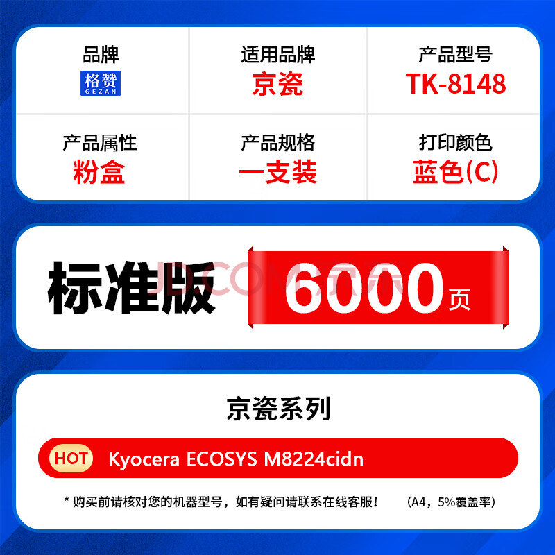 商品相册:格赞 TK-8148粉盒蓝色 适用京瓷墨粉筒kyocera ECOSYS M8224cidn碳粉彩色复印机硒鼓墨盒第