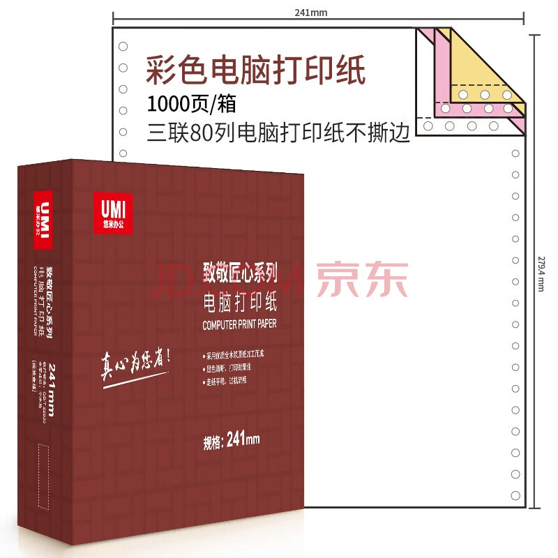 商品相册:安兴三联整张不撕边彩色电脑打印纸 针式打印纸送货单出库单(241-3S 色序:白红黄 1000页/箱)第