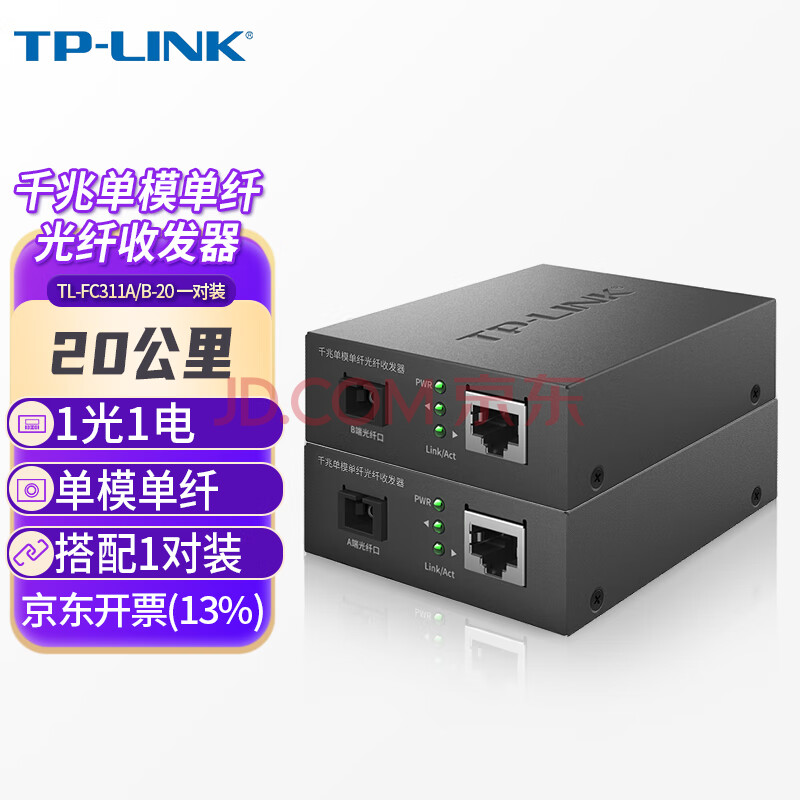 商品相册:普联(TP-LINK)普联千兆单模单纤光纤收发器一对1光1电转换器20公里传输SC接口TL-FC311A-20+TL-FC311B-20套装第
