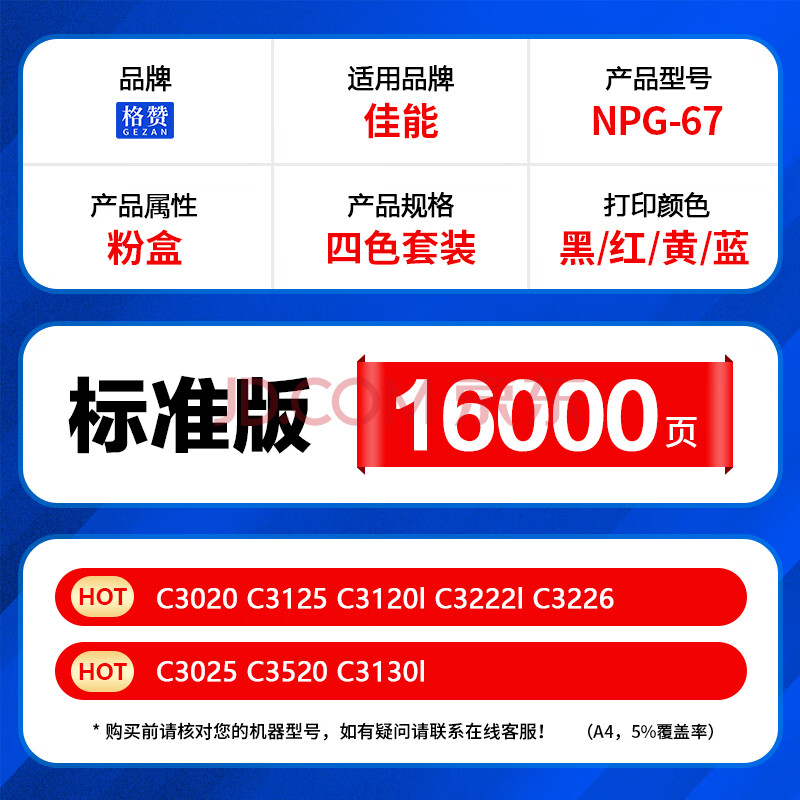 商品相册:格赞NPG-67粉盒四色适用佳能C3020墨盒C3222L C3130L C3120L C3125 C3226硒鼓C3320 C3530复印机碳粉墨粉盒墨粉第
