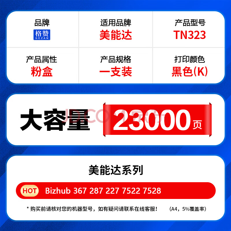 商品相册:格赞TN323粉盒适用柯尼卡美能达Bizhub 367墨粉287 227 7522 7528震旦ADT369 AD369s/289s墨盒硒鼓墨粉盒 大容量第