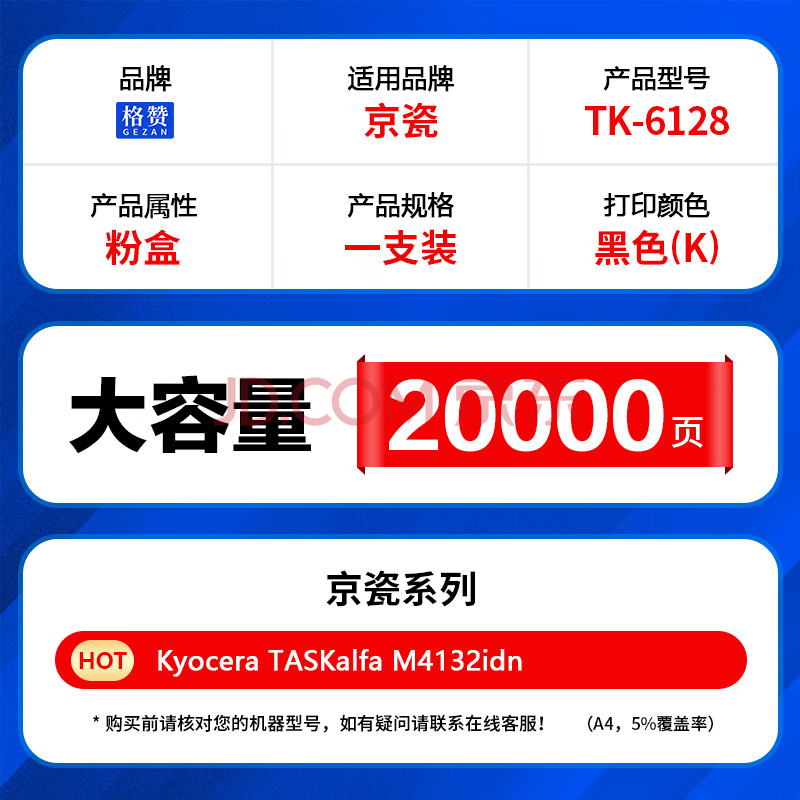 商品相册:格赞 TK-6128粉盒 适用京瓷Kyocera ECOSYS M4132idn数码复合机墨盒 复印机碳粉和 打印机墨粉盒第