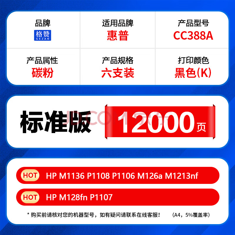 商品相册:格赞388a 88a碳粉6支装 适用惠普cc388a m1136打印机墨粉p1108 p1106 m126a m1213nf m128fn打印机墨盒硒鼓第