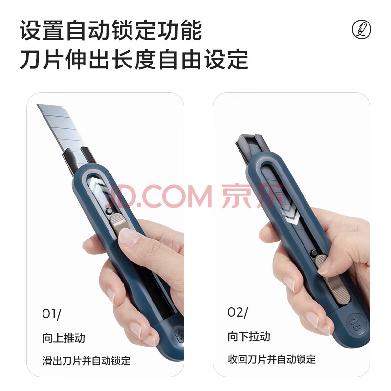 商品相册:得力(deli)大号撞色设计美工刀壁纸刀裁纸刀 办公用品 尾部自带折刀器 蓝色 NS062第