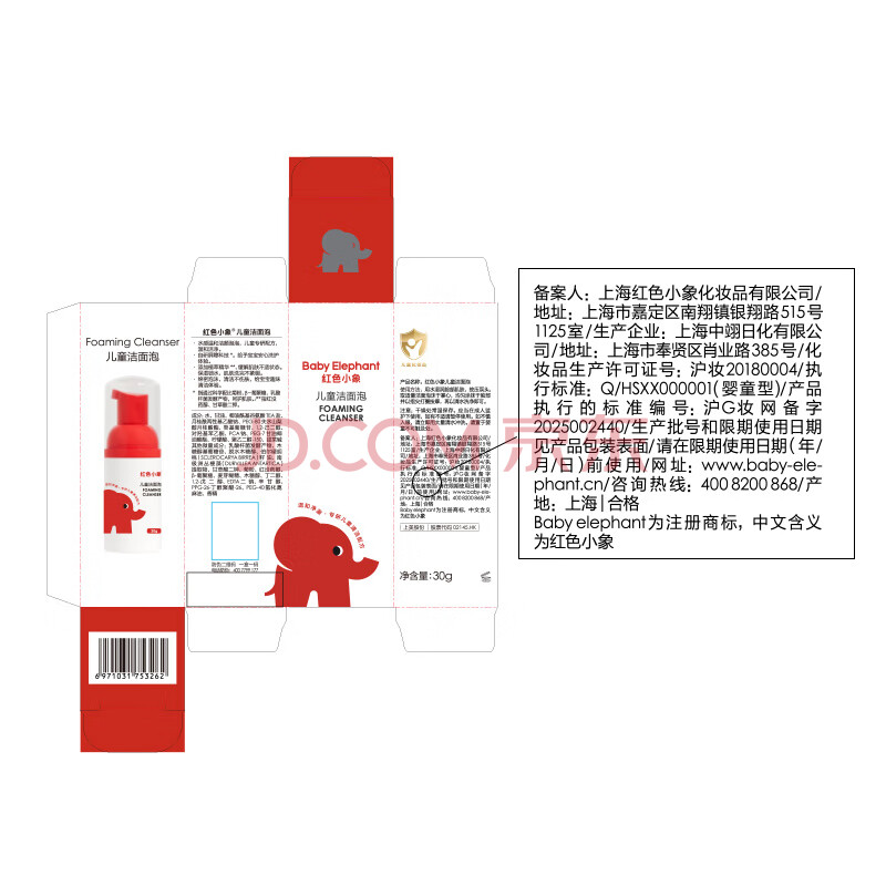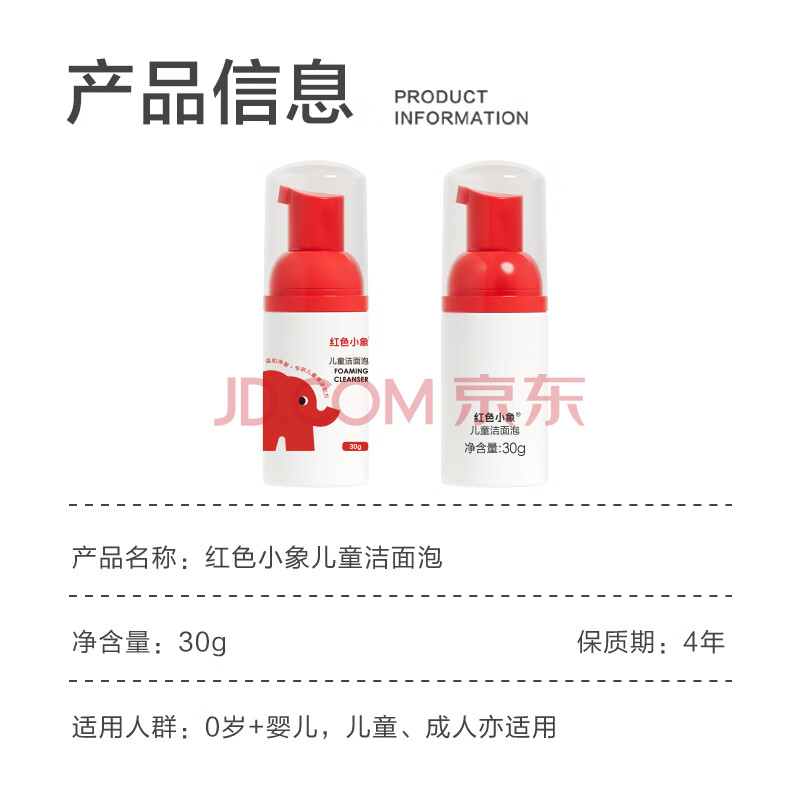 商品相册:红色小象儿童洁面泡30ml 温和清洁护肤保湿滋润洗面奶 试用装第