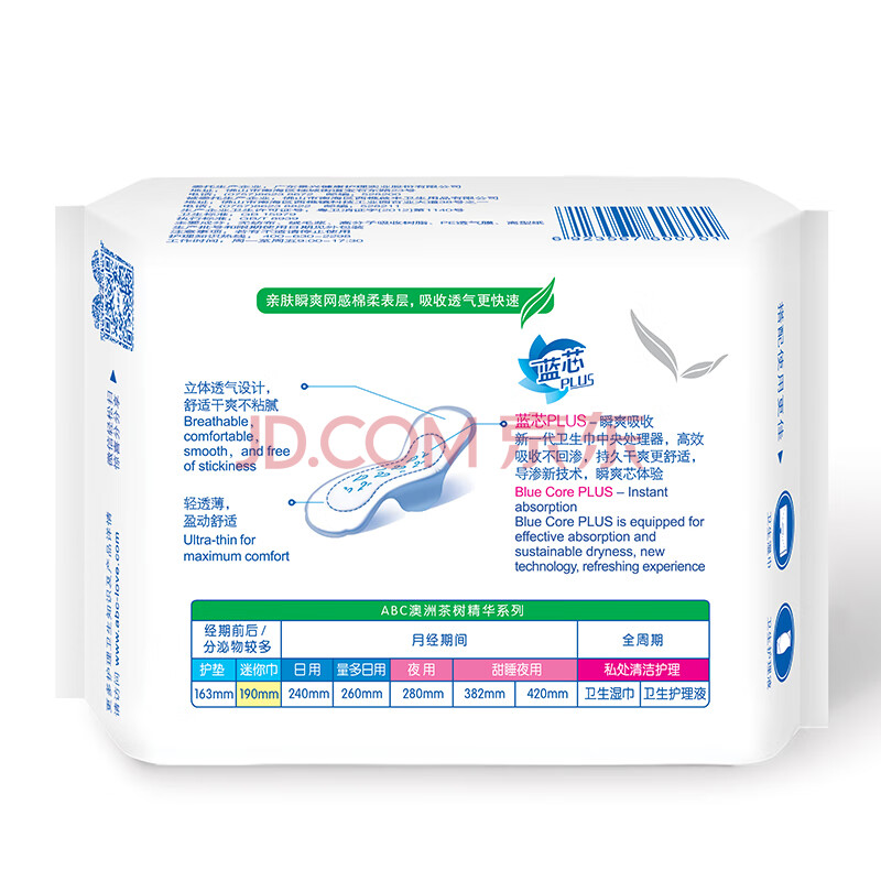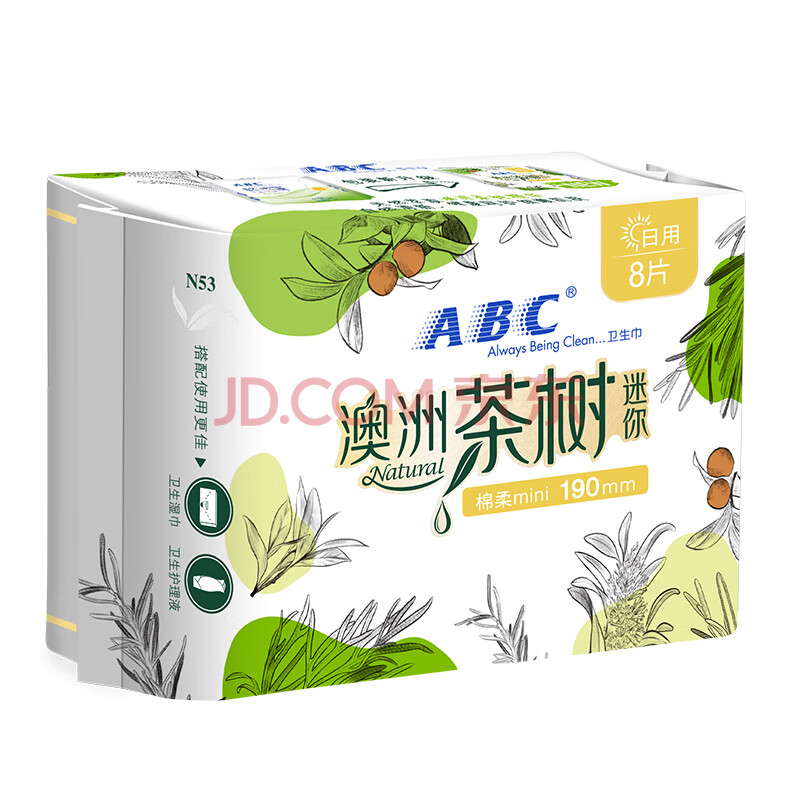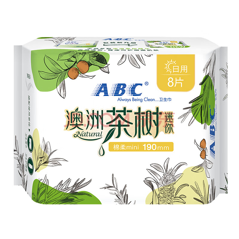 商品相册:ABC澳洲茶树精华超薄透气迷你巾卫生巾京东自营姨妈巾190mm*8片第1张/共7
