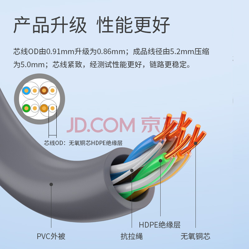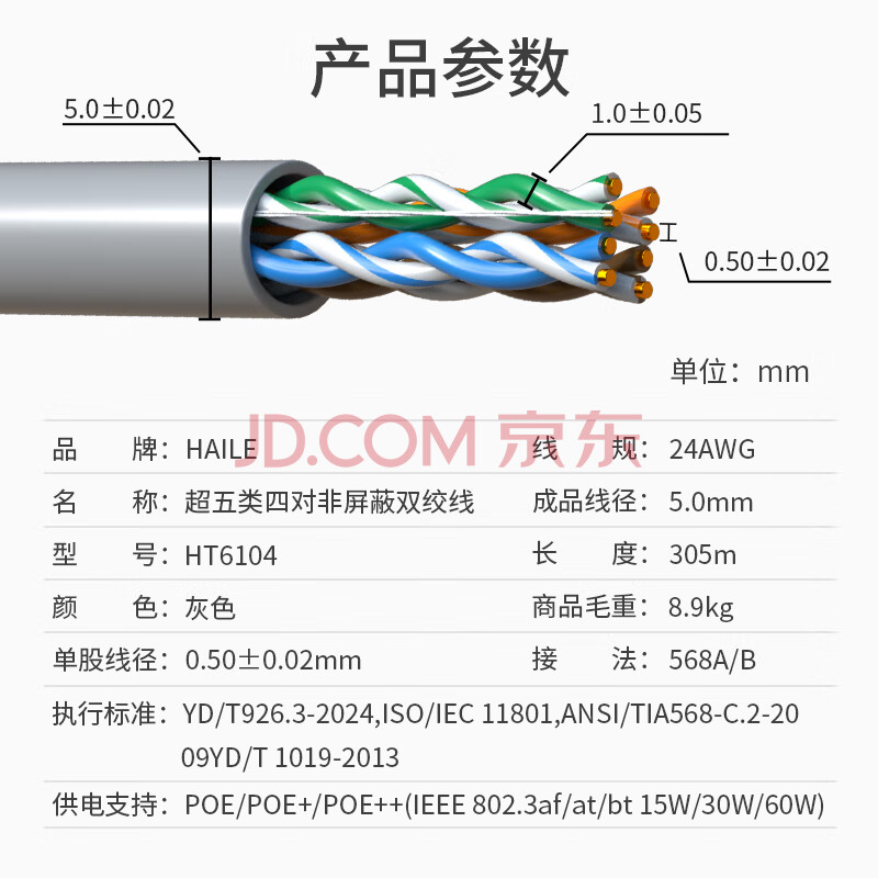 商品相册:HAILE海乐超五类网线HT6104灰CAT5E无氧铜0.5线芯非屏蔽支持POE供电灰色 305米第
