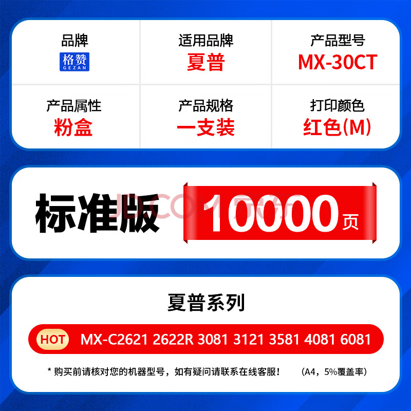 商品相册:格赞MX-30CT红色适用夏普MX-C2622R粉盒C3081 3581 4081墨盒5081 6081 2621 3082 6082打印机硒鼓复印机墨粉60CT第