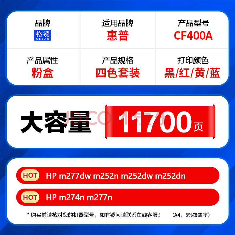 商品相册:格赞CF400A硒鼓四色套装201A适用惠普m277dw硒鼓m252n/dw/dn m274n墨盒m277n佳能CRG045 mf633cdw粉盒 大容量第