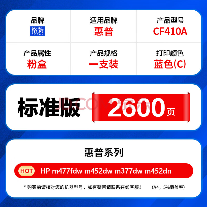 商品相册:格赞CF410A硒鼓蓝色适用惠普HP m477fdw/dn墨盒m452dn/dw/nw彩色打印机m377dw粉盒佳能CRG046 653Cdw MF732Cdw第