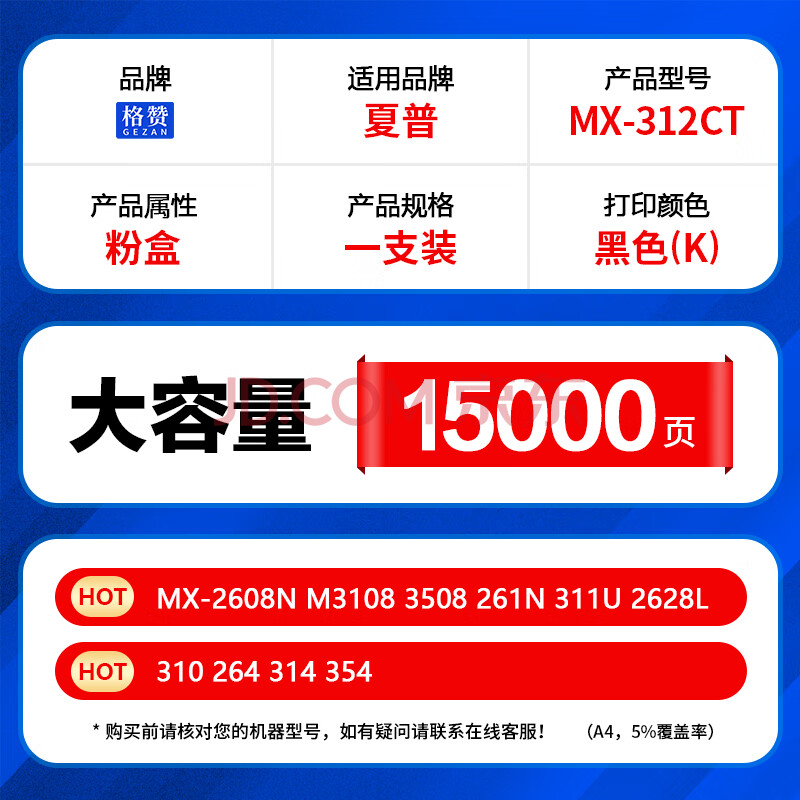 商品相册:格赞MX-312CT粉盒 适用夏普MX-2608N M3108 3508 261N 311U 2628L U N墨粉310 264 314 354墨盒 硒鼓第