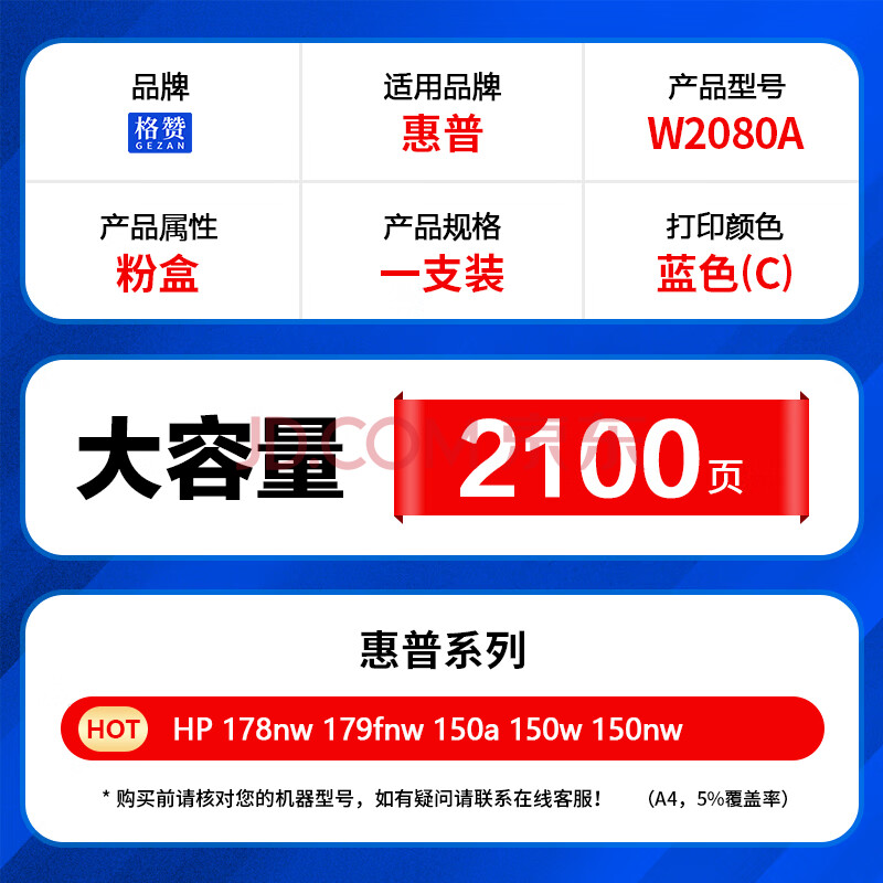 商品相册:格赞 W2080A硒鼓蓝色118A 适用惠普HP 178nw硒鼓 179fnw 150a 150w 150nw打印机粉盒墨盒墨粉盒 大容量带芯片第