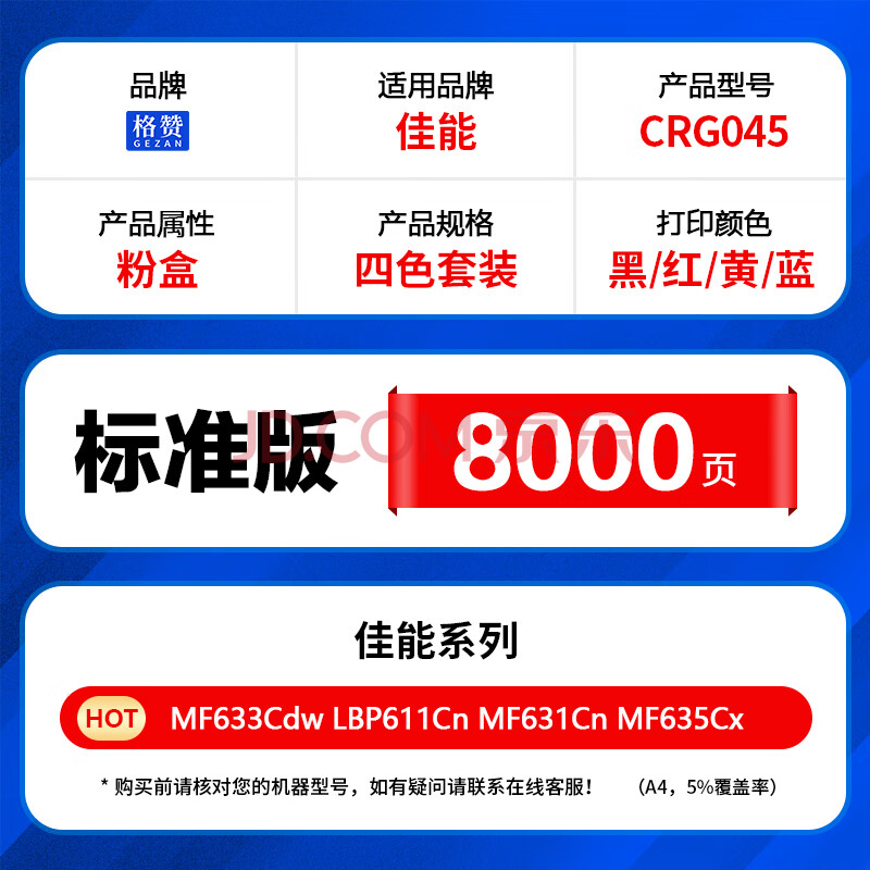 商品相册:格赞CRG-045硒鼓cf400a适用佳能MF633Cdw LBP611Cn MF631Cn MF635Cx惠普m277dw粉盒m252n m252dw墨盒四色套装第