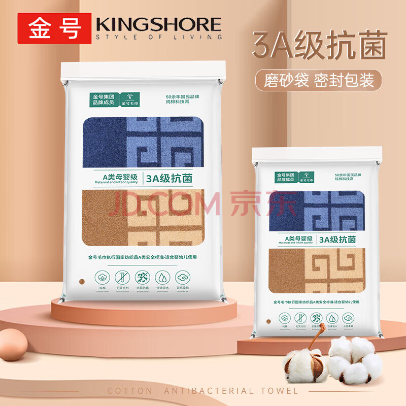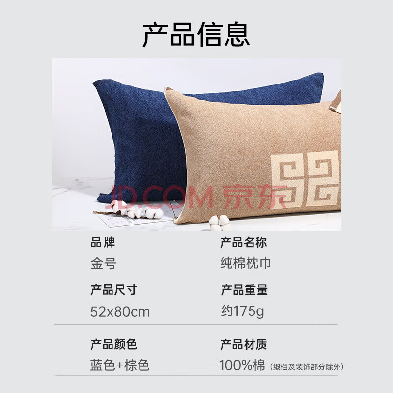 商品相册:金号纯棉枕巾 3A抗菌加大加厚全棉透气枕头巾一对装蓝+棕 50*80cm175G第1张/共8
