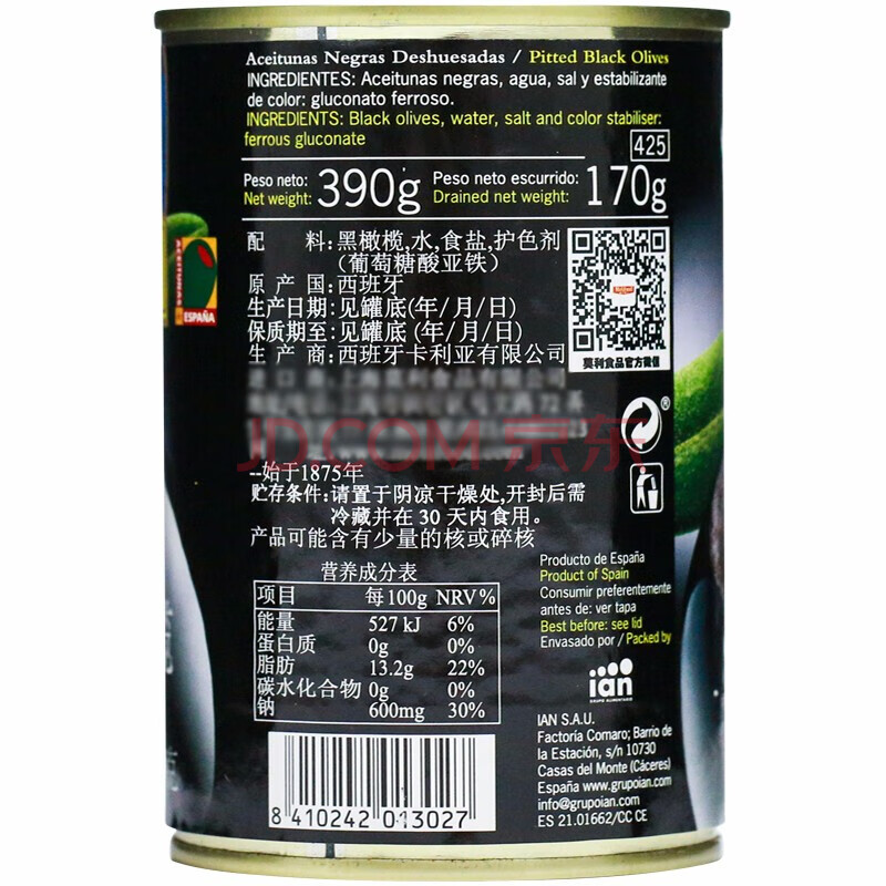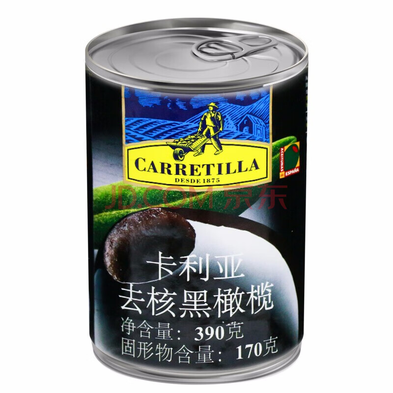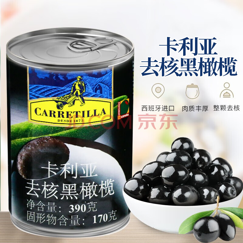 商品相册:卡利亚西班牙进口 去核黑橄榄(铁罐)沙拉披萨无核黑水榄西餐用390g第